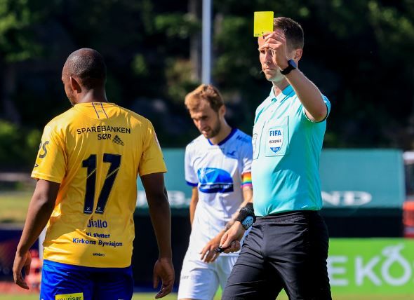 Norheim klipper ned Zafeiris, og har nettopp fått gult. Kunne fort vært ferdig der, men slipper med frispark imot.