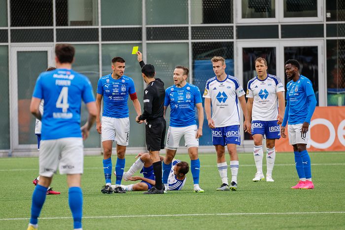 Soleklart gult kort når han kommer altfor fort inn med en takling på Frederiksberg ved innbytterbenkene.