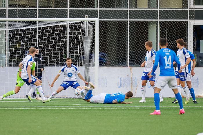 Enorm sjanse for Klaksvik! Kassi kjemper frem en skuddmulighet for Frederiksberg, som dunker til på direkten utenfor 16-meteren. Karlstrøm sklir ved streken, men heldigvis for Molde-keeperen stryker skuddforsøket stolpen! Nære på for Hoseths lag!