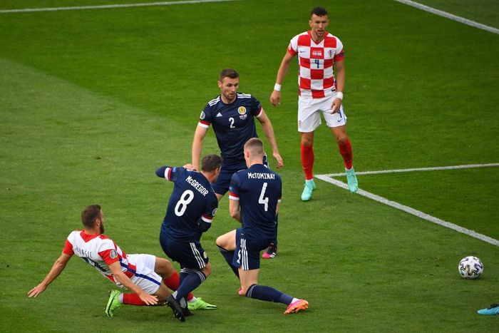 SKOTTLANDS FØRSTE I MESTERSKAPET! Det eksploderer på tribunene i Glasgow! Vidas klarering er svak - rett til McGregor som fra 18 meters hold banker ballen i mål! Fire kroater kaster seg inn for å blokkere skuddet, men det ender med nettsus! Foto: Reuters.