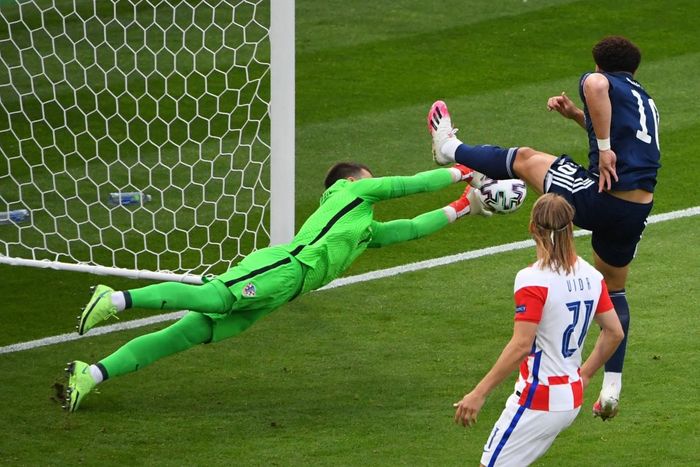Skotsk mulighet på kontring. Adams får ballen på bakre etter at innlegget er innom et par kroater. Får til ålreit skudd, men rett på Livakovic.