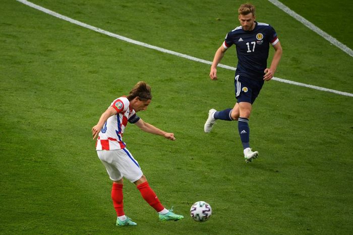 Luka Modric danser seg rundt Skottland-spillerne på Hampen Park-gresset. Er så elegant.