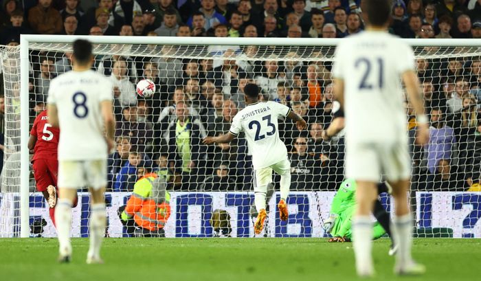 FOR EN BRØLER! Konaté sløver og tror han har bedre tid enn han har. Sinisterra presser og er plutselig alene med Alisson. Vingen avslutter iiiiiskaldt, og chipper Leeds inn i kampen igjen! 1-2!