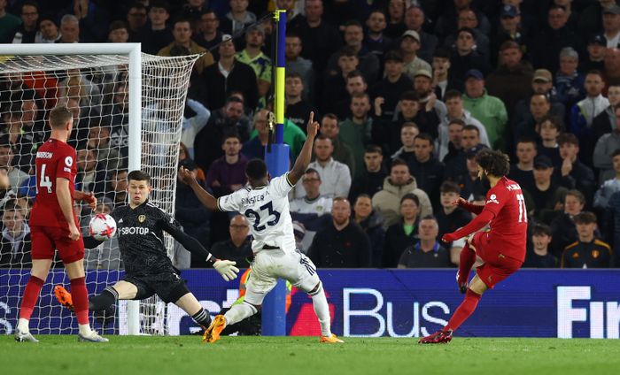 IGJEN! Liverpool leker seg på Elland Road! Gjestene triller og triller før Henderson får slått inn fra høyre. Jota banker til på direkten fra 16-meteren, og Meslier er sjanseløs!