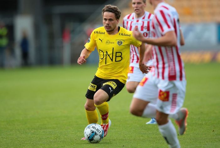Yttergård Jenssen går i bakken i duell med Ibrahimaj. Frispark. Pettersson protestere og publikum piper.