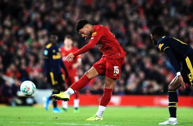 Tidligere Arsenal-spiller Oxlade-Chamberlain spilles fri og er alene med keeper. Han får en dårlig førstetouch og keeper får ryddet opp.