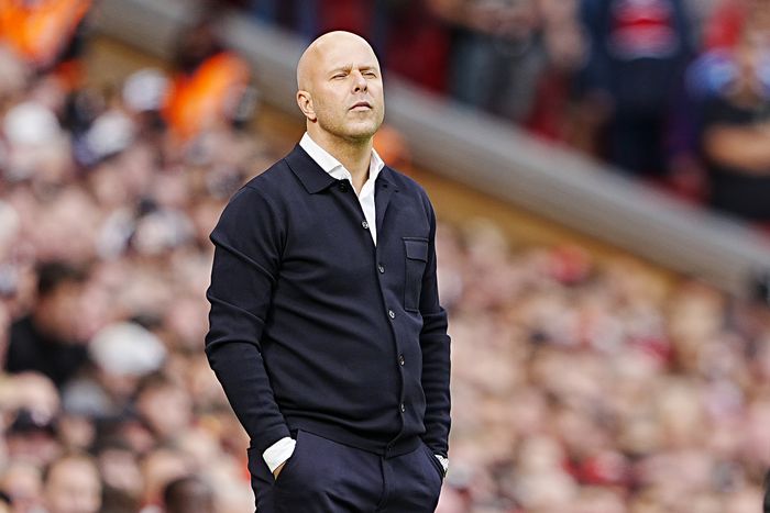 Virgil van Dijk borte på sidelinjen hos Arne Slot og får noen beskjeder.
