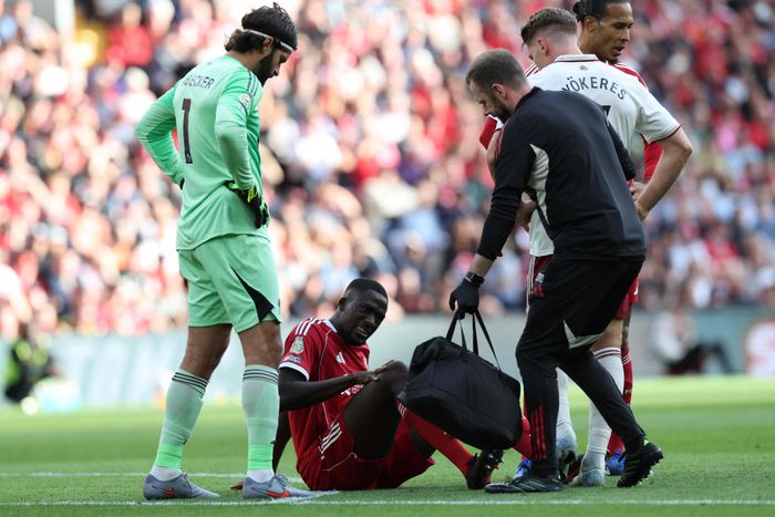 Det ser ut som om Konate sliter litt. Sitter nede på gresset.