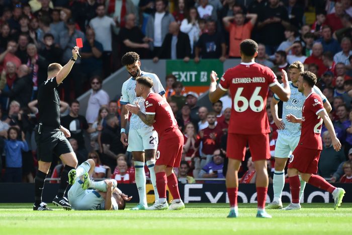Kortet blir ikke omgjort av VAR. Midtbanemannen går i garderoben, og Liverpool må klare seg med én mann mindre resten av kampen.