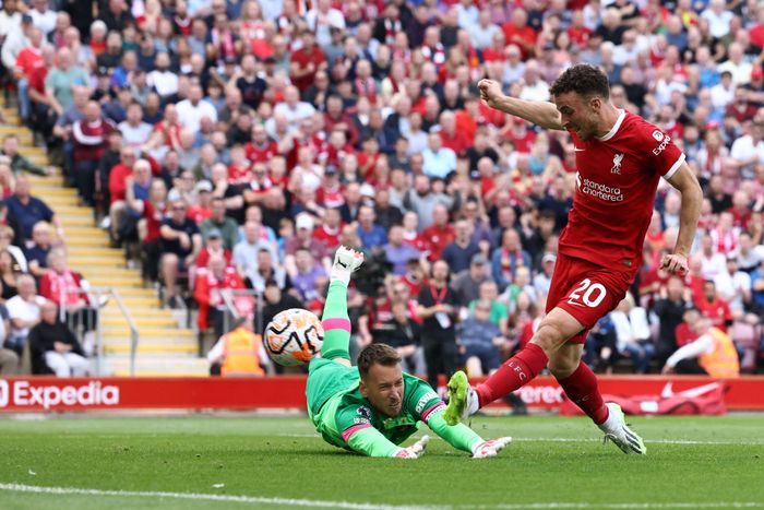 ØKER LEDELSEN! Hjemmelaget øker til 3-1 bare tre minutter etter å ha blitt ti mann! Szoboszlai dundrer til utenfor 16-meteren, og Neto må gi retur. Der er Jota som enkelt setter inn Liverpools tredje for kvelden! Foto: AFP