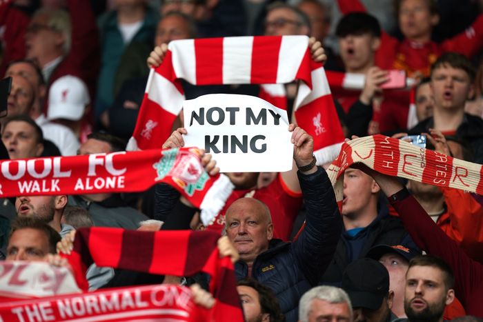 Nasjonalsangen "God save the king" spilles av i forbindelsen med kroningen. Liverpool-supporterne er ikke spesielt glade i sentralmakten nede i London: Mange piper.