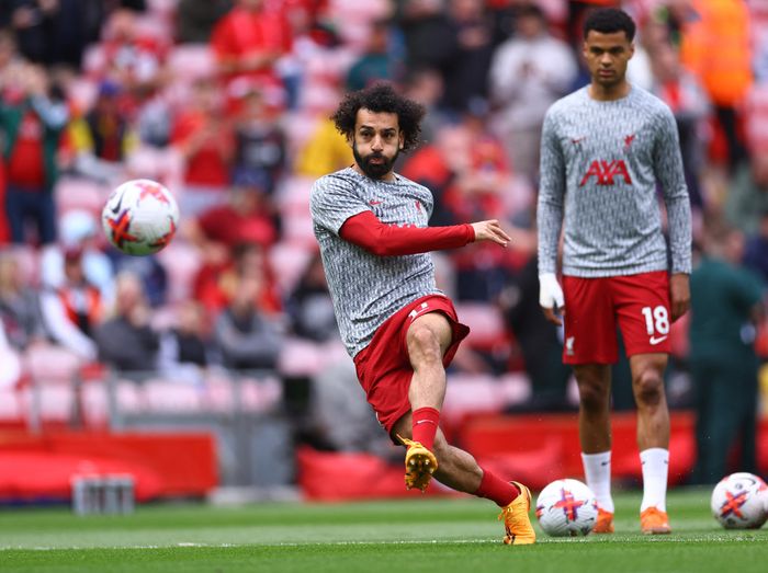 Mohammed Salah er i gang med oppvarmingen på Anfield. Egypteren ble matchvinner på straffespark mot Fulham onsdag.