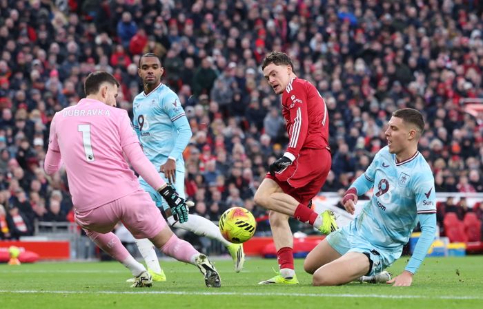 Gravenberch prøver lykken fra distanse. Treffer en Burnley-spiller og ut til hjørnespark.
