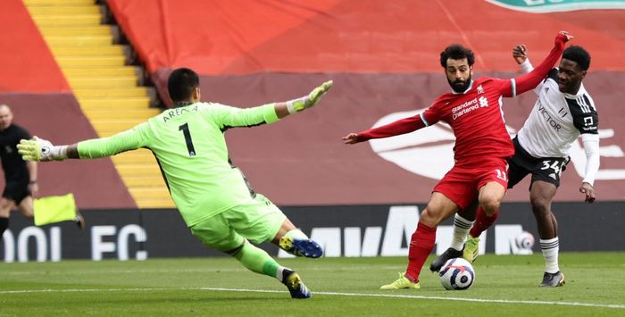Salah farlig frempå. Går i bakken innenfor Fulham-boksen, men spillet vinkes videre. Aina som er oppe med en arm der.