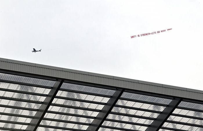 Et fly med et støttende banner til Jürgen Klopp var nettopp over Anfield. "Unity is strength - let's go Reds YNWA", står det der. Foto: PA Photos.