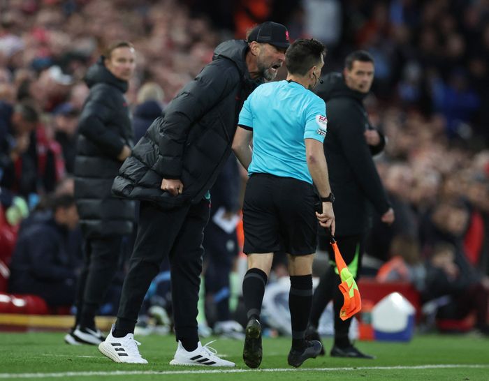 Klopp springer langt ut av teknisk sone og kommer med en ganske klar melding i retning assistentdommer. Foto: Phil Noble/Reuters