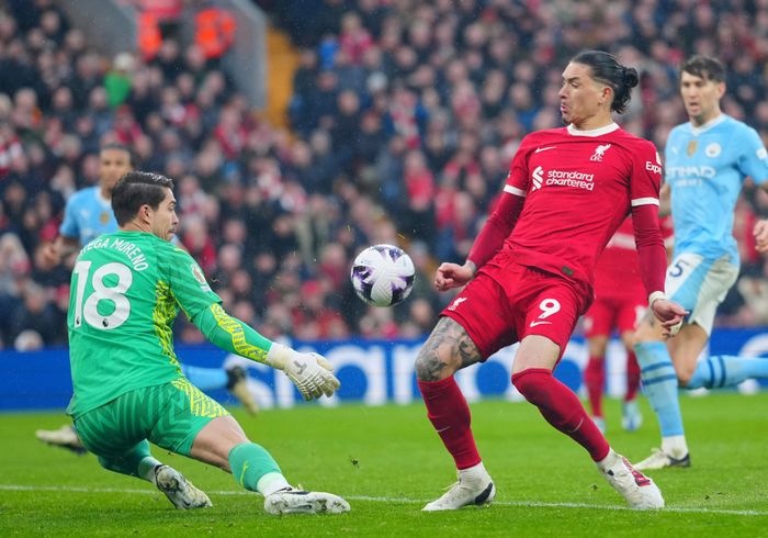 Liverpool har virkelig våknet. Vinner ballen på Citys halvdel før Diaz kommer seg til innlegg på venstrekanten. Finner Nunez i boksen, men klarer ikke få ordentlig trøkk i headingen. Foto: AFP