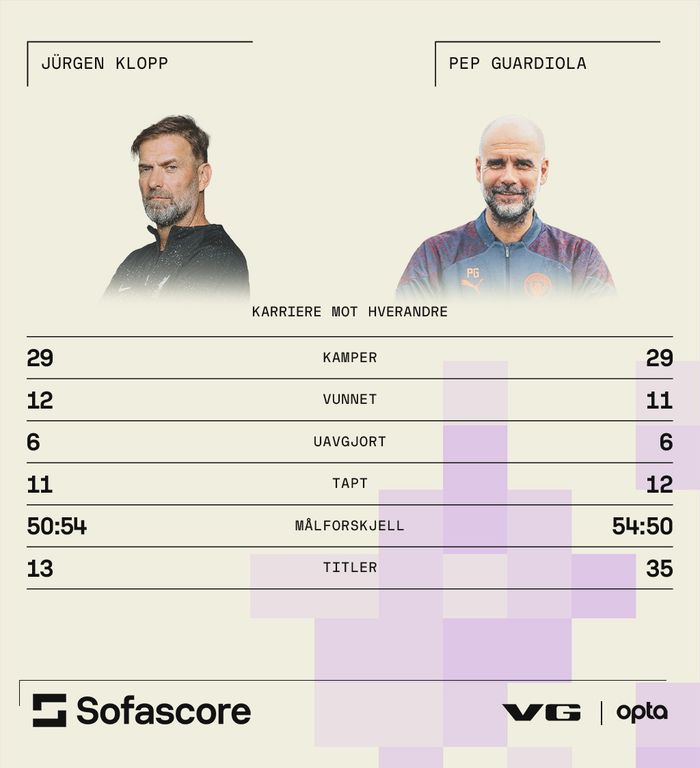 Flere enorme dueller på banen i dag, men også blant lagenes managere. Sjekk denne jevne statistikken fra Sofascore mellom Jürgen Klopp og Pep Guardiola: