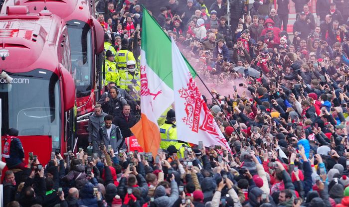 Slik ble Liverpool-troppen tatt imot av fansen utenfor Anfield. Foto: AP