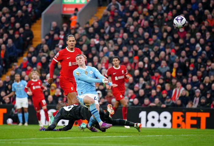 Foden treffer tverrliggeren med armen (!) etter en redning fra Kelleher. Liverpool får frispark i 16-meteren. Foto: Pa Photos