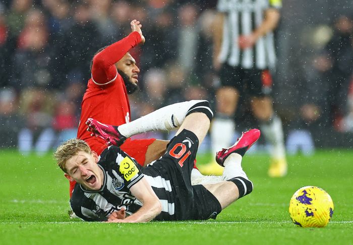 Nunez holdes. Får ingenting. Newcastle slår en langpasning uten adresse.