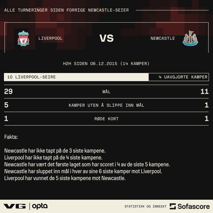 Siden den gang har Liverpool og Newcastle møttes 14 ganger. Tallene lover ikke godt for de som heier på bortelaget i kveld