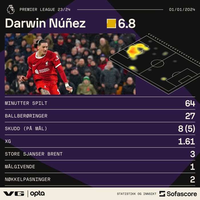 NÅ ER DET JO NÆRMEST USERIØST. Nunez header upresset, men til side for mål. Skal ikke score, Darwin.