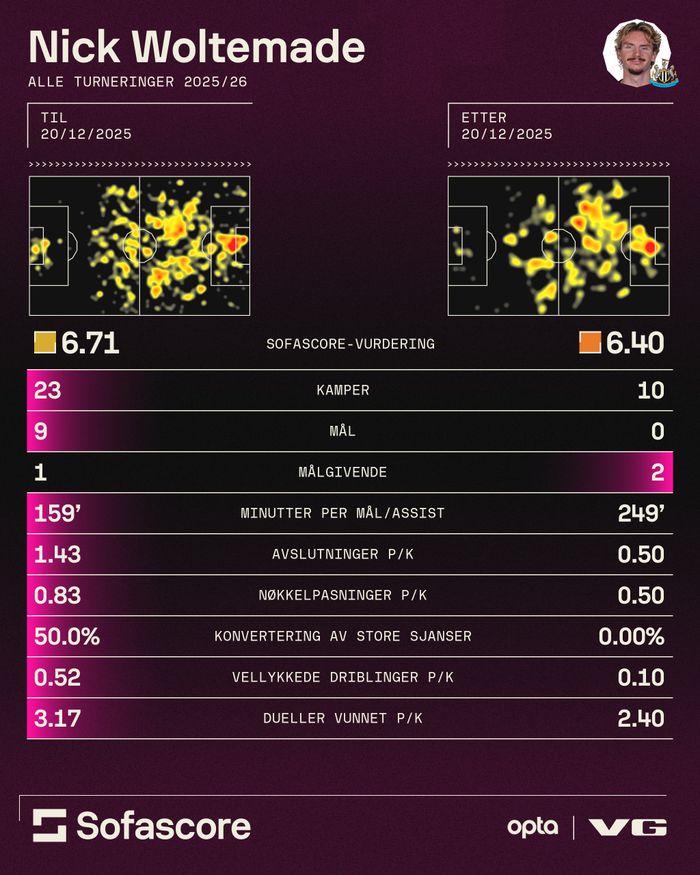 Newcastle brukte Isak-salget til å hente Yoanne Wissa og Nick Woltemade. Sistnevnte har kun produsert ett mål i ligaen og har slitt med skade. Tyskeren har vist seg som et godt kjøp, men har nylig slitt med å finne nettmaskene.