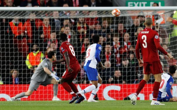 Liverpool er i føringen. Det skuddet fra Keita går via en Porto-forsvarer og skifter retning. Casillas er utspilt og ballen går helt oppe i hjørnet.