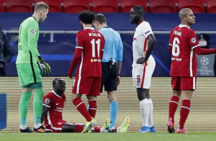 Mané blir liggende etter at keeper kommer ut og bokser unna i feltet. Han kolliderer delvis med keeper og sin egen lagkamerat Phillips. Ser litt groggy ut, men fortsetter etter litt behandling.