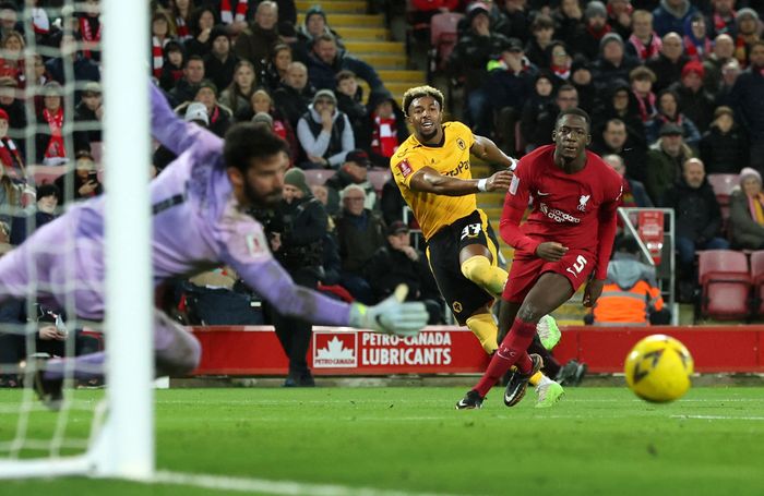 UTLIGNING! Fint angrep av Wolves før Cunha får slått inn fra venstre. Hwang kommer først på den, men Konate blokkerer. Så spretter ballen tilbake på Hwang, som er heldig når ballen triller i mål!