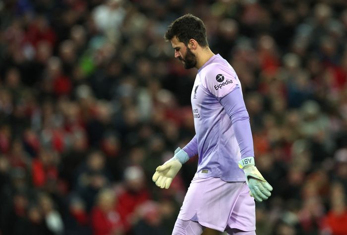 Alisson slår en elendig pasning mot Robertson. Tydelig frustrert idet ballen går ut av banen, skotten.