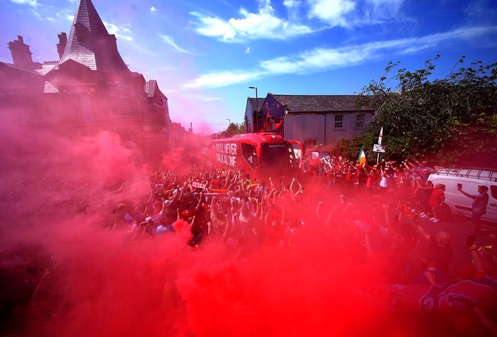 Spillerbussen til Liverpool fikk en varm velkomst på Anfield. Foto: Peter Byrne / Pa Photos / NTB