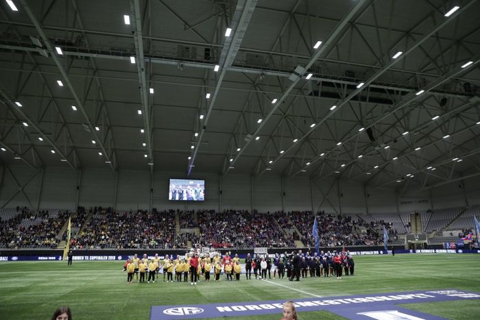 Spillerne entrer kunstgresset. Straks duket for cupfinale! Foto: NTB Scanpix.