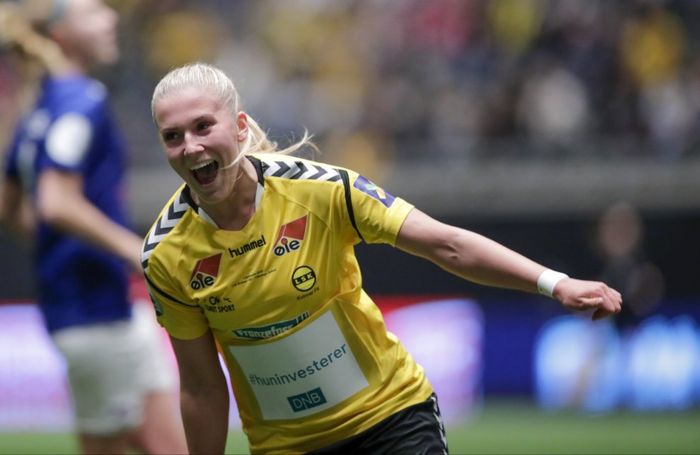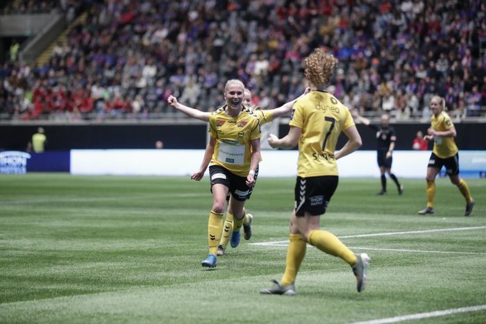 DER SITTER DEN! Anja Sønstevold KLINER til etter fint kombinasjonsspill med Skinnes Hansen - via tverrliggeren og i mål! Foto: NTB Scanpix.