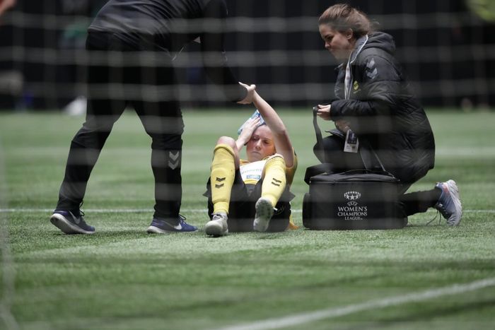 Skinnes Hansen får en strålende mulighet når hun skyter fra venstre side, men banker ballen over.