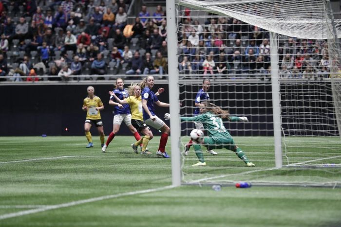 DET ER TRE! Det er overkjøring! Emilie Nautnes med sin andre for kvelden! LSK ruller opp på høyre, Skinnes Hansen slår den 45 grader ut og der er Nautnes som enkelt setter ballen i mål. Foto: NTB Scanpix.