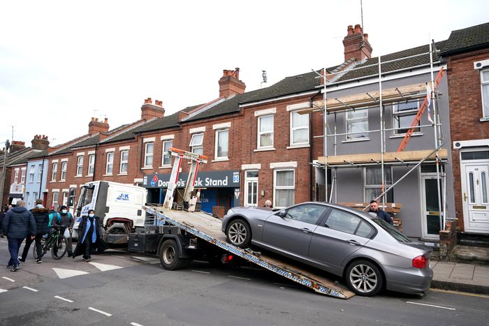 ... og så har vi en bil som står i veien og blir tauet vekk. «Dominos Oak Stand» er en del av stadion og fikk navnet til denne sesongen. Foto: Pa Photos.