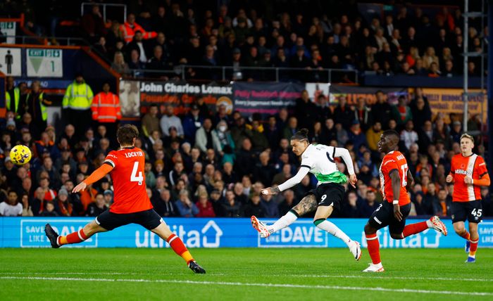 Diaz og Tsimikas kombinerer, før sistnevnte slår inn. Luton får stanget ballen unna.