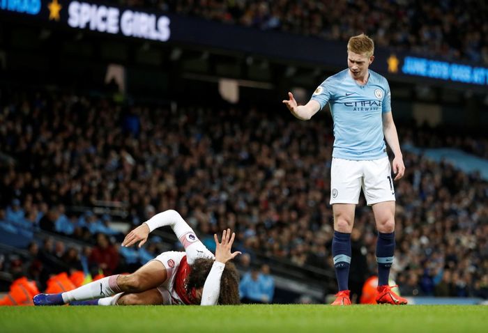De Bruyne hindrer Lacazette idet franskmannen skal sende avgårde en pasning. Gjestene får frispark.