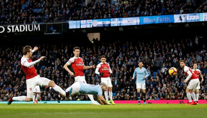 DET SMELLER FØR MINUTTET ER SPILT! 46 sekunder, for å være presis. Vertene går rett i angrep og Arsenal klarer ikke å klarere. Laporte vinner ballen fra Iwboi, svinger ballen inn foran mål og der venter Agüero, som stupheader ballen i mål! Foto: Reuters.