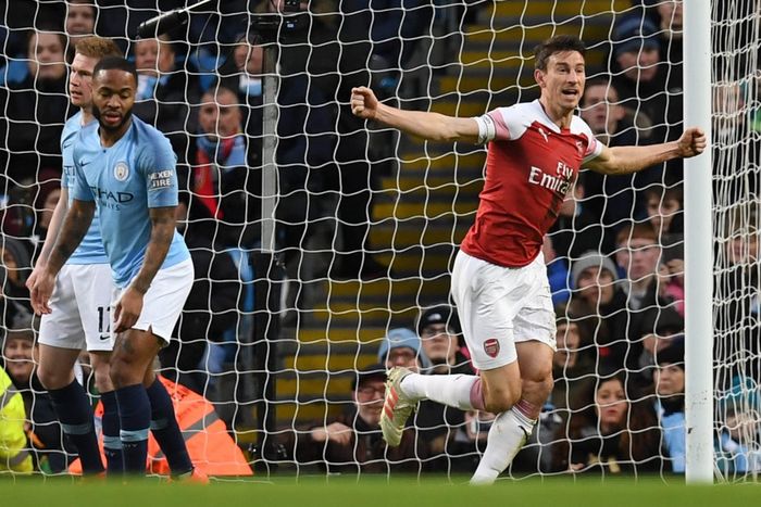 UTLIGNING! Og det er Laurent Koscielny som finner nettmaskene! Torreira sender den inn på første, der vinner Monreal duellen. Han stusser ballen bak, og på bakerste stuper Koscielny frem og stanger ballen opp i nettaket! Foto: AFP.