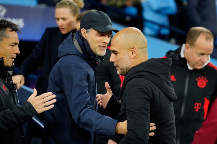 Pep Guardiola hilser på sine gamle venner i Bayern München, inkludert trener Thomas Tuchel (skyggelue). Foto: AP