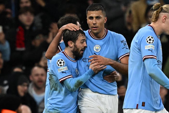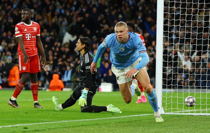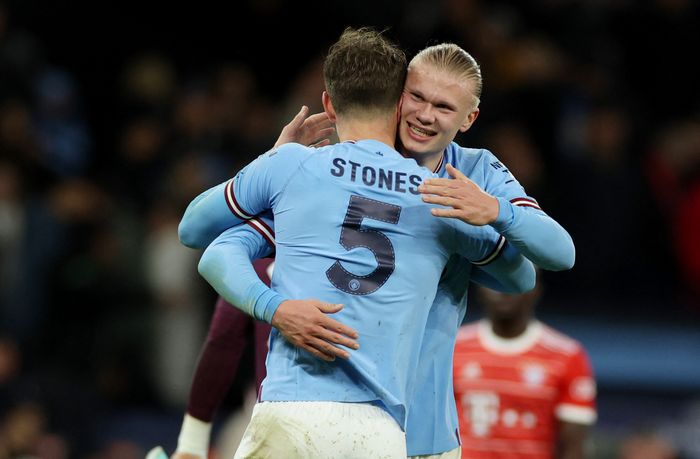 Erling Braut Haaland omfavner John Stones etter seieren over Bayern. Foto: Reuters