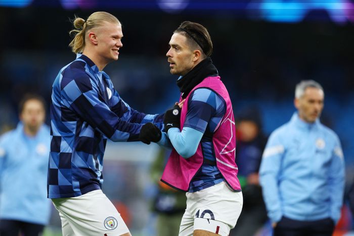Erling Braut Haaland og Jack Grealish har det gøy på oppvarmingen. Foto: Reuters