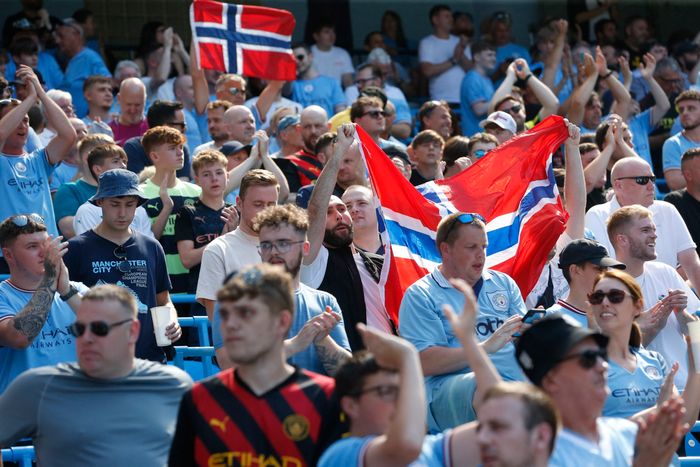 En del norske flagg på Etihad i dag. Foto: Reuters.