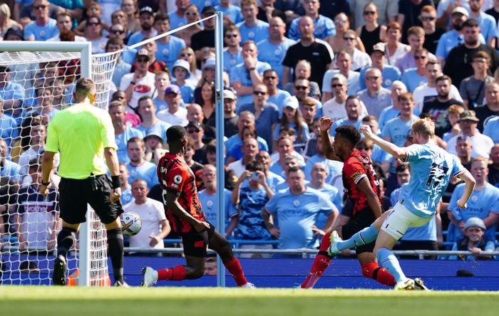 Fotballkunst av de Bruyne! Belgieren forserer oppover på Bournemouths banehalvdel, og har med seg Haaland. Når muligheten til å spille til nordmannen ikke åpner seg, går de Bruyne i stedet på skudd. Og det gjør han strålende. Med utsiden av foten plasserer han ballen i det lengste hjørnet. Nydelig scoring. Foto: Pa Photos.