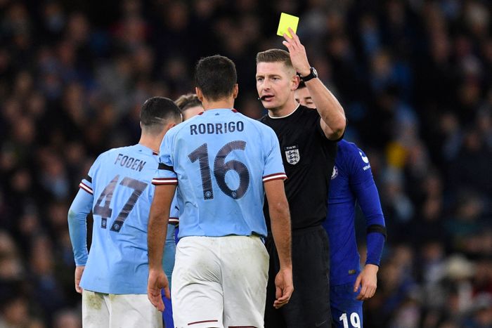 Så blir Rodri tatt sent i duell med Havertz. Blir liggende og slå i bakken.