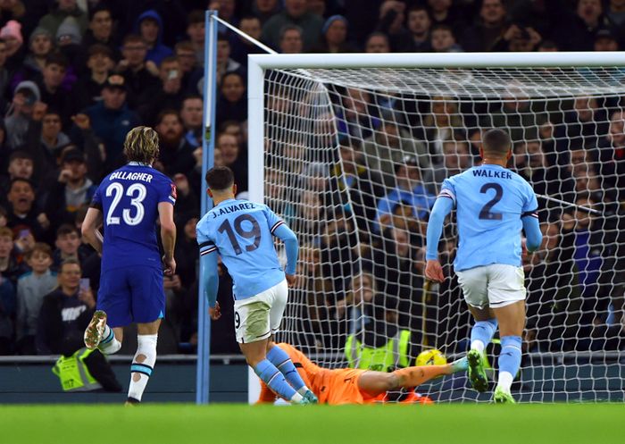 Kjempemulighet for unggutten Palmer!! Blir spilt i bakrom på nydelig vis og får all tid i verden med Kepa. Kan spille Alvarez ved siden av på blank kasse, men prøver i stedet å tre den i korthjørnet. Går i nettveggen. VM-vinner Alvarez oppgitt.