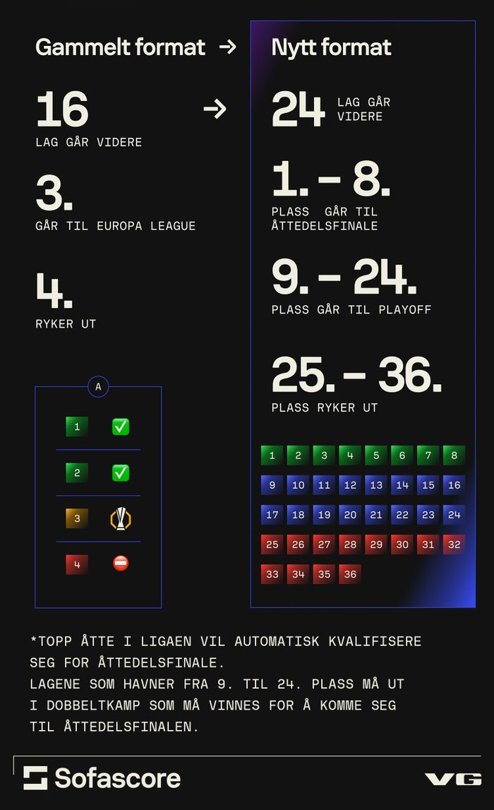 Et nytt format i Champions League som venter oss i år. Les om det her: https://www.vg.no/sport/i/W0g4ar/champions-league-slik-blir-det-nye-gruppespillet-i-europacupene